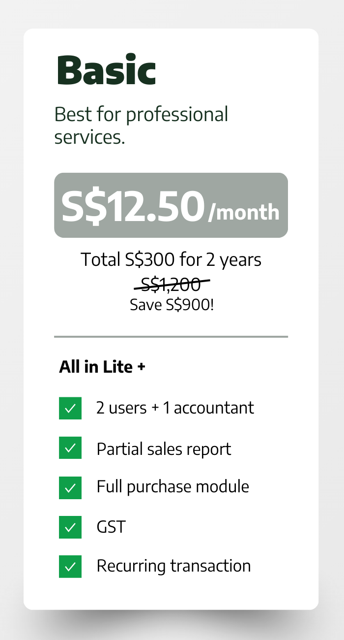 Fully GST-ready, e-invoicing (Peppol) & InvoiceNow enabled. Stay Audit-Ready.